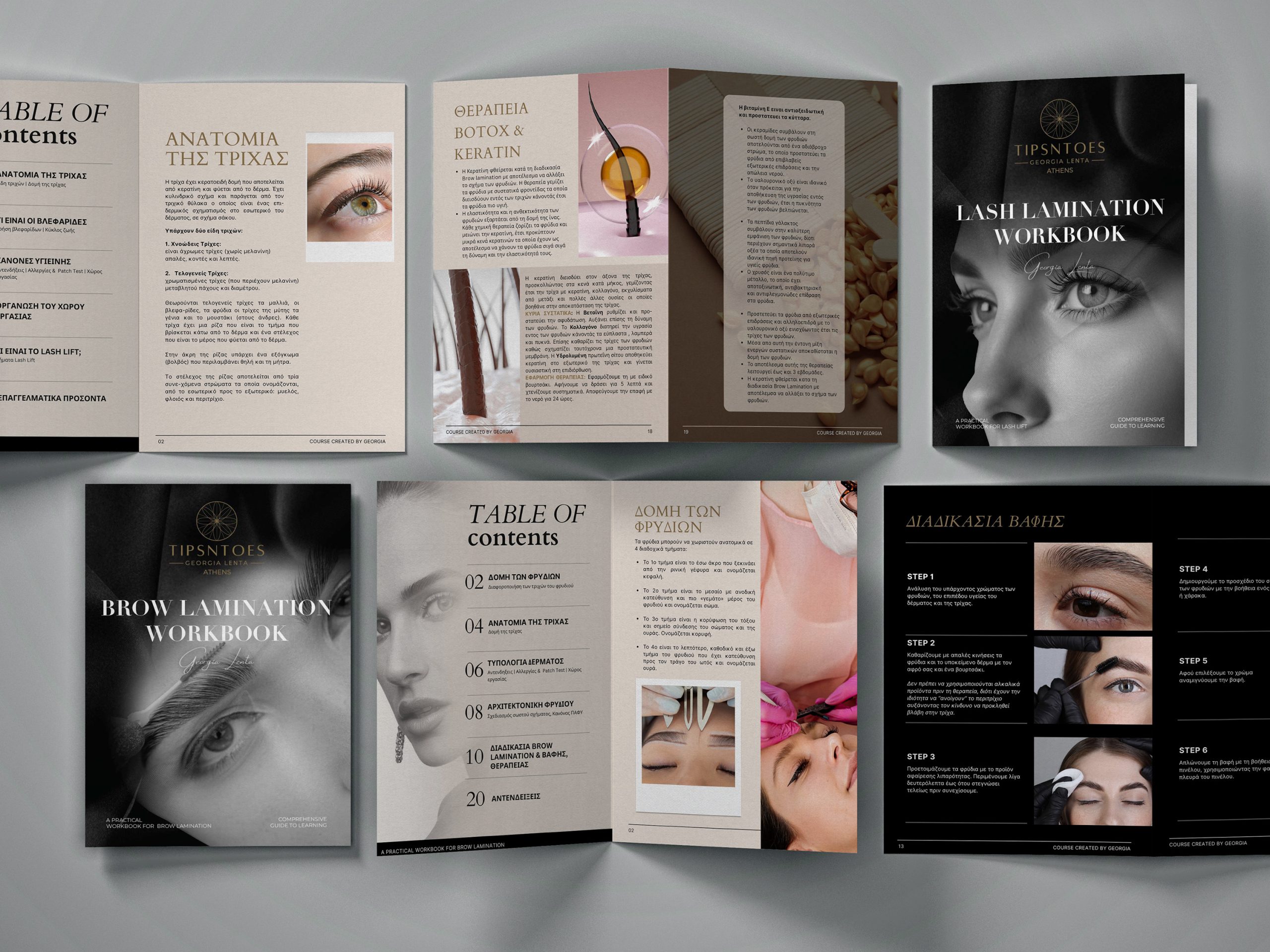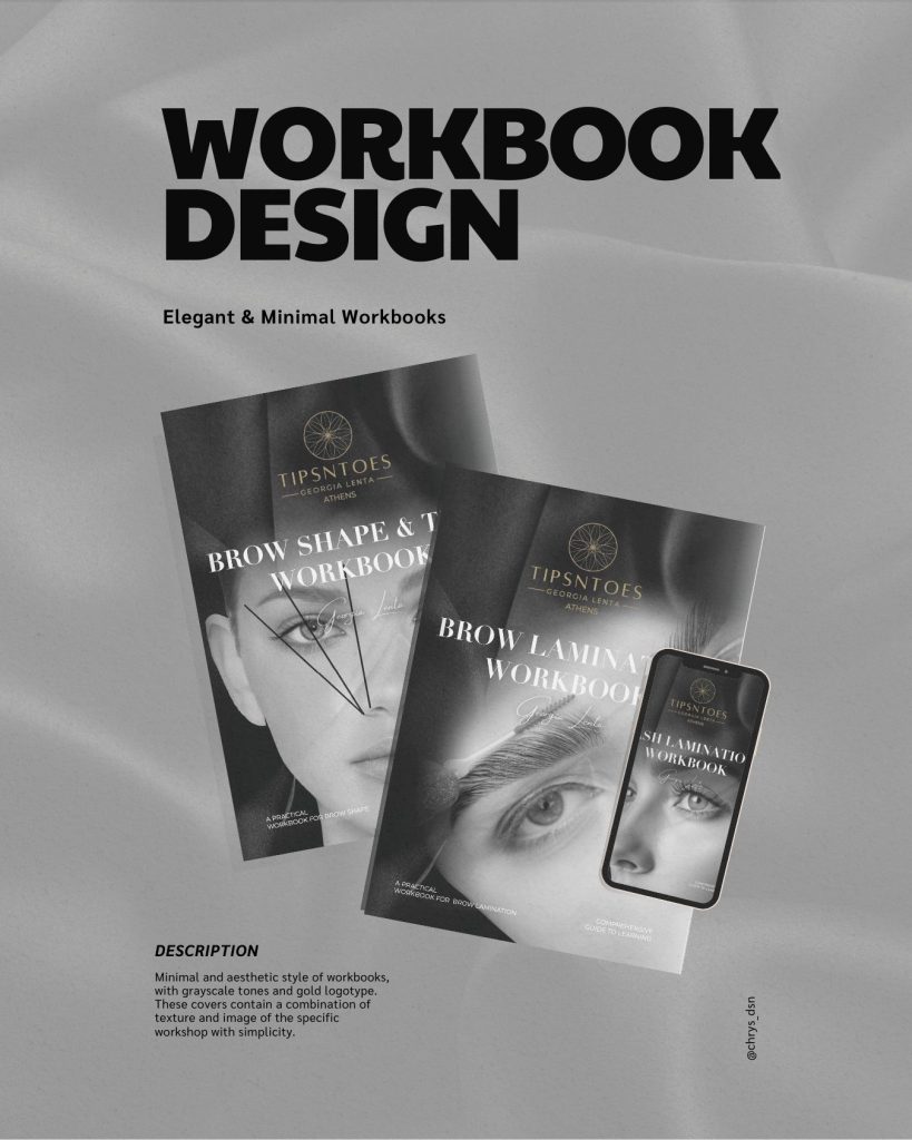 The layout of each booklet enhances readability and visual flow. It allows the content to stand out without distractions. The minimalistic design highlights clean lines and generous white space. This approach presents every detail about brow lamination, lash lamination, and brow shaping with clarity and sophistication. Muted grey and beige tones create a cohesive look that feels understated yet luxurious. The design appeals to clients who value subtle beauty and expert care.